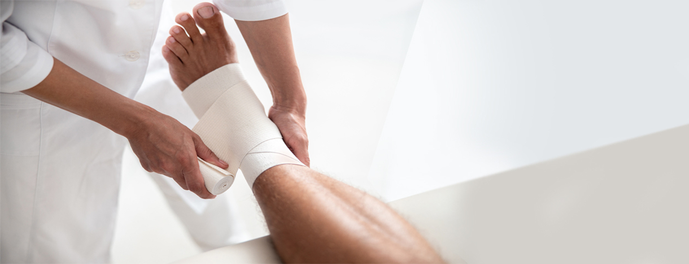 После надлежащей обработки раны приступают к бинтованию ног эластичным бинтом.